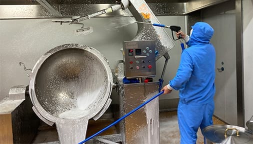 Foam cleaning machines are used for the cleaning and disinfection of equipment, surfaces, and production areas within the fried food processing factory.