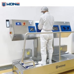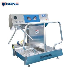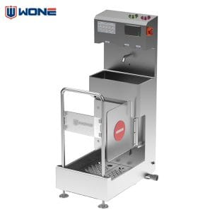 The hygienic design of the WONE hygiene station for food factories is reflected in the disinfection pool water level adjustment, the inclined surface to prevent standing water and splashing water, and the inclined design for easy drain.
