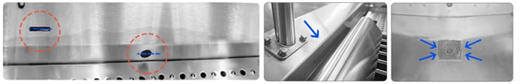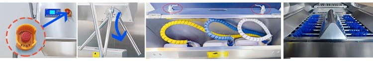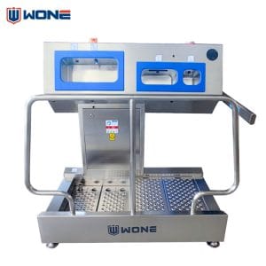 The safety design of the WONE hygiene station lies in the emergency stop button, the guard that automatically opens when power is off, sensor device to let the machine not start if there is a safety hazard such as an unevenly placed panel.