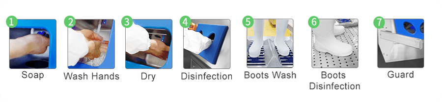 Designed with a range of innovative features, our hygiene station goes beyond traditional hand hygiene solutions, offering a comprehensive array of functions to cater to diverse hygiene needs. From advanced biometric security to boot cleaning, boot disinfection, hand washing, hand drying, and disinfection capabilities, our hygiene station entrance sets a new standard in elevating hygiene practices across food industries.