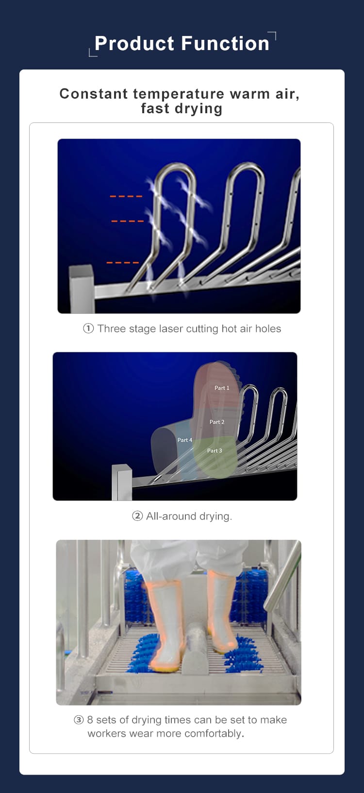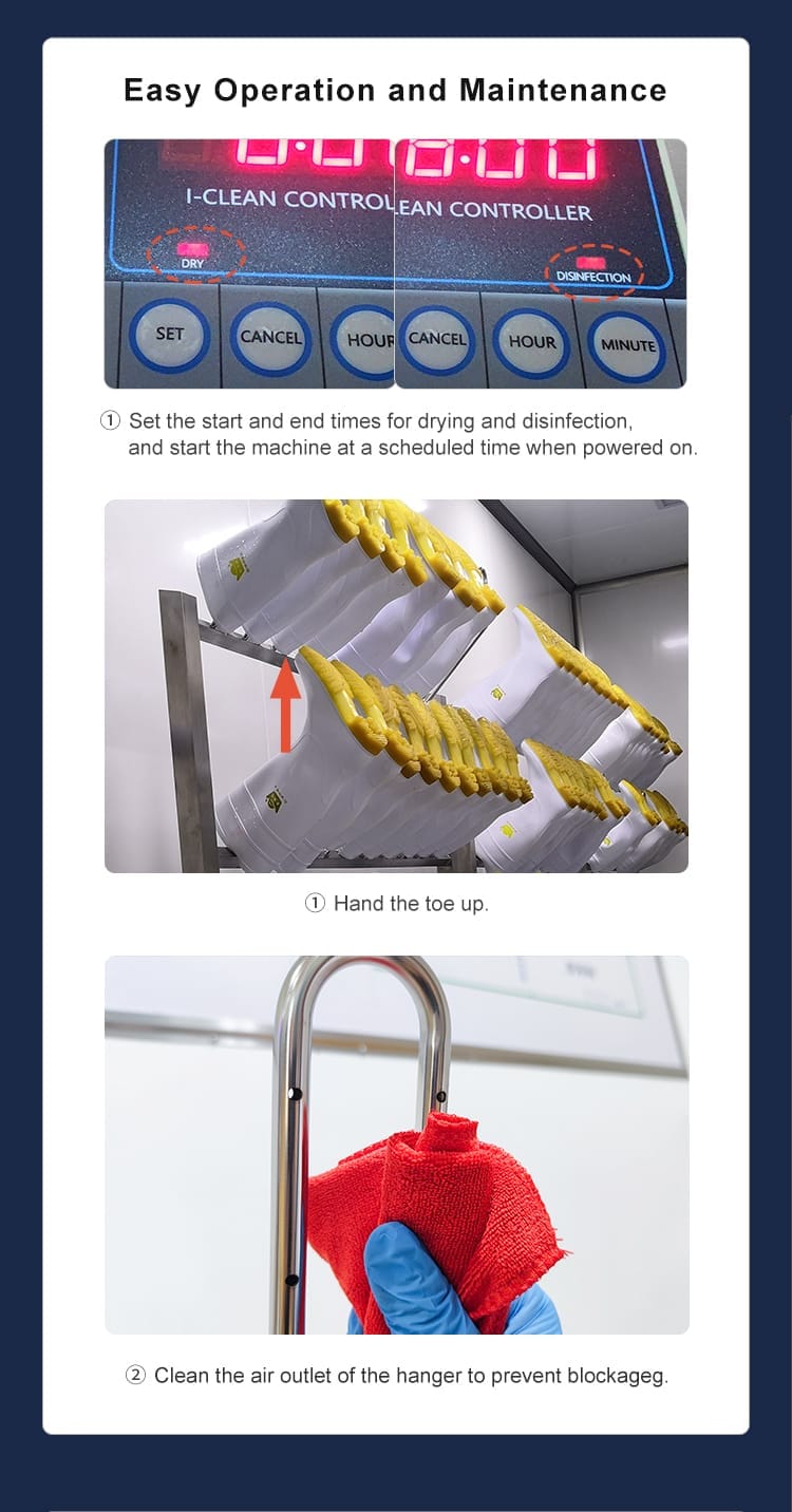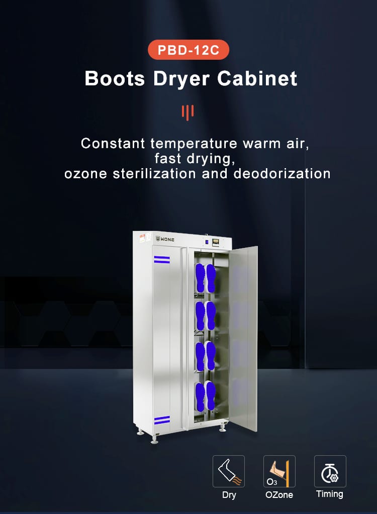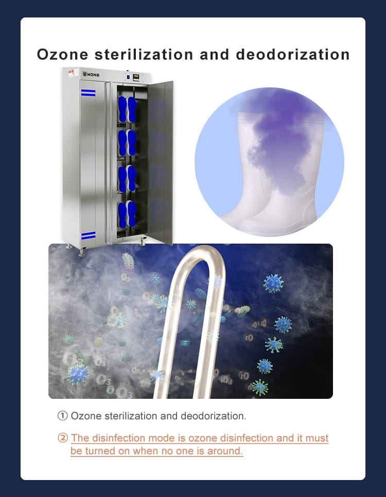 – The unique design of our boot dryers integrates both ozone and hot air technologies to deliver a comprehensive drying and sanitizing solution. The ozone generator produces powerful oxidizing ozone gas, effectively eliminating bacteria, viruses, and other contaminants, while the hot air circulation system rapidly dries the boots, ensuring they are ready for use.