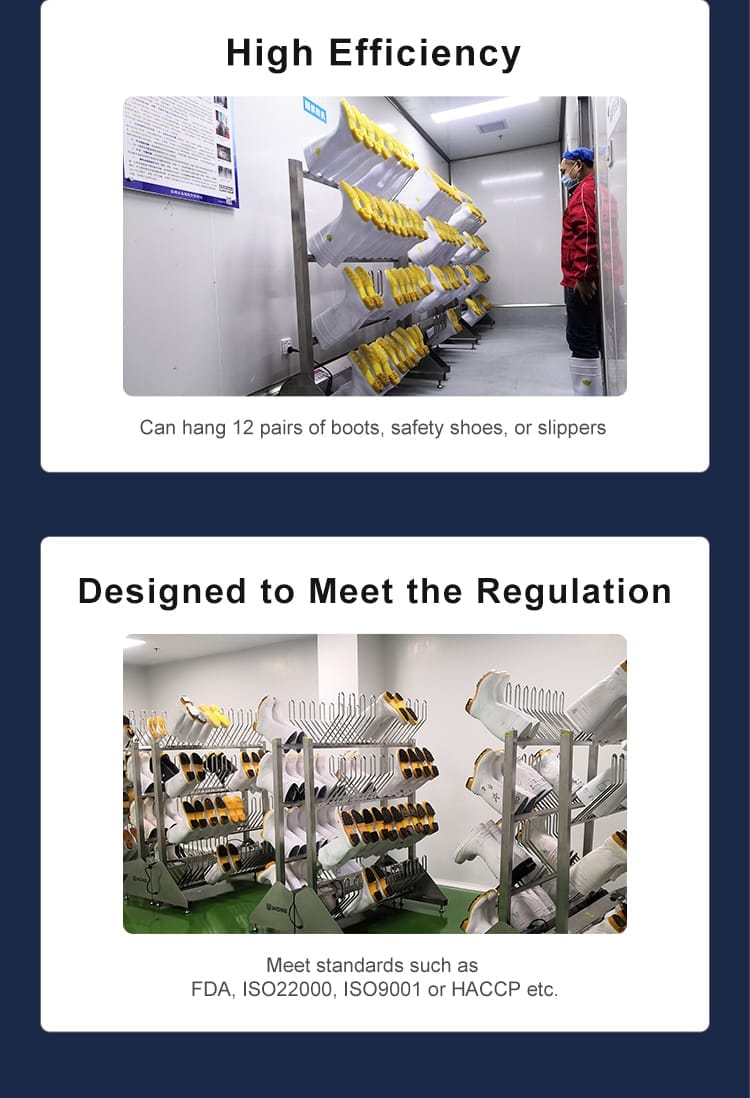 Many food safety regulations and standards, such as those set by the FDA (Food and Drug Administration) or HACCP (Hazard Analysis and Critical Control Points) programs, require the implementation of effective hygiene and sanitation measures, including the use of boot drying equipment in food processing facilities. The ozone and hot air boot dryers help food companies to comply with these regulations and maintain a high level of food safety.