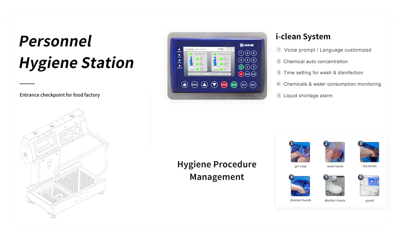 4. Easy Use: our hygiene stations sanitize sensor-based hand and boot cleaning. Furthermore, we also set the voice prompts for hygiene steps, so the food factories do not need to spend additional time on training and use.
