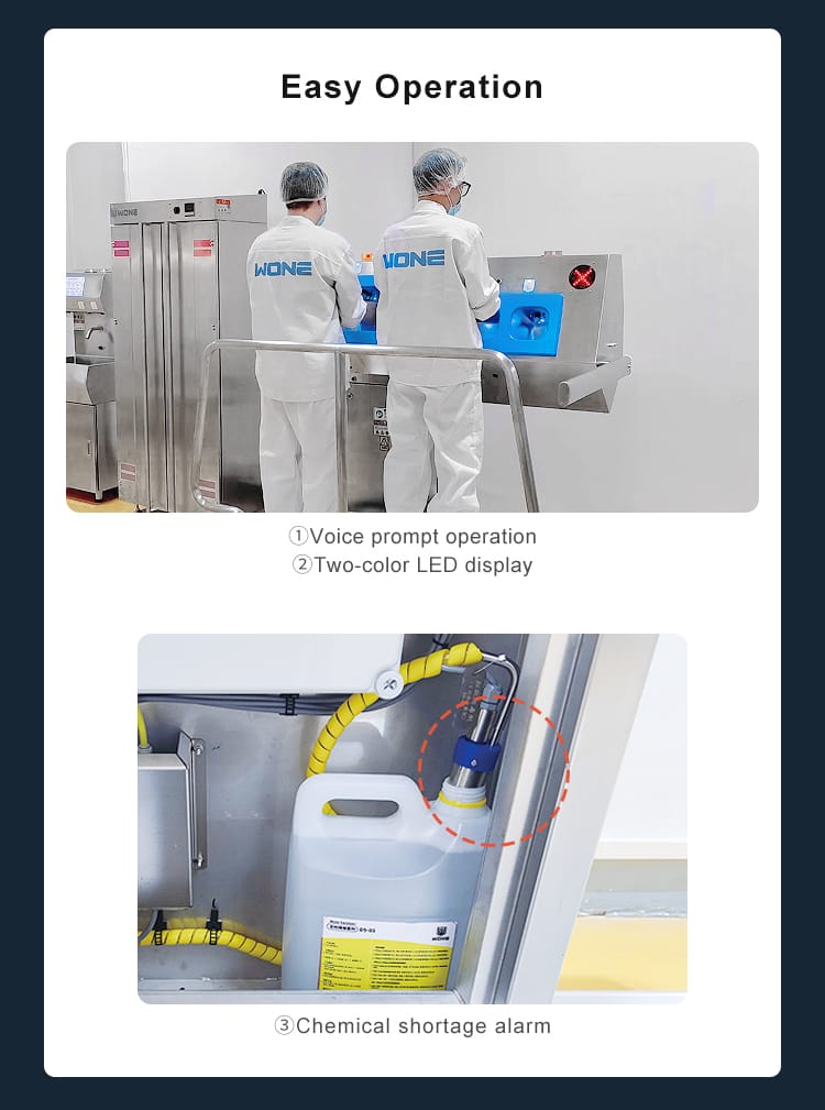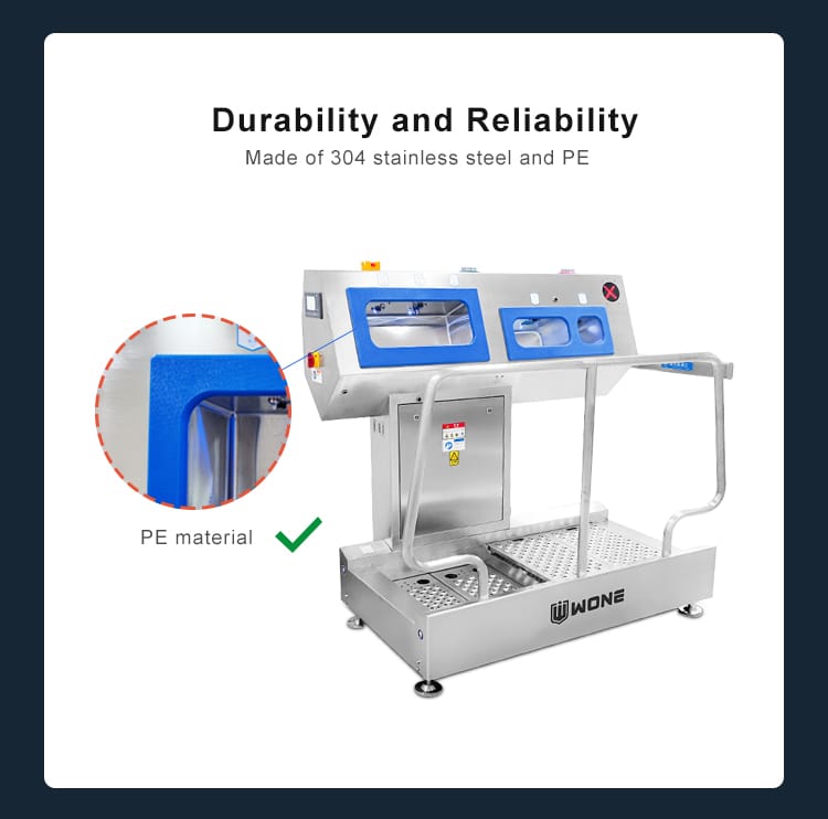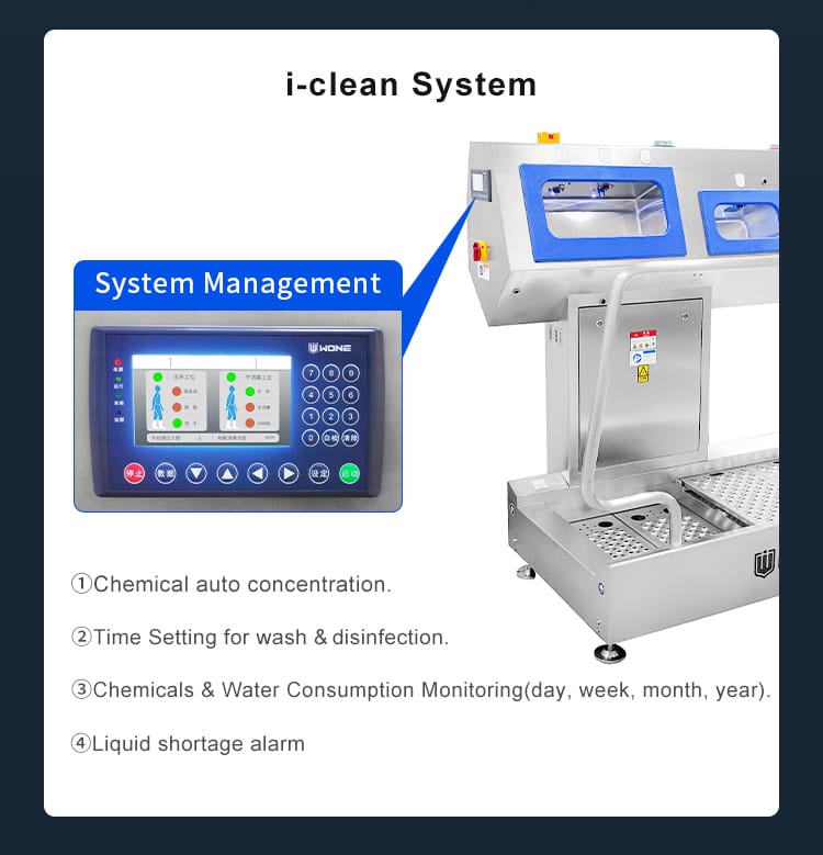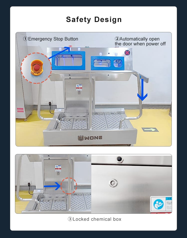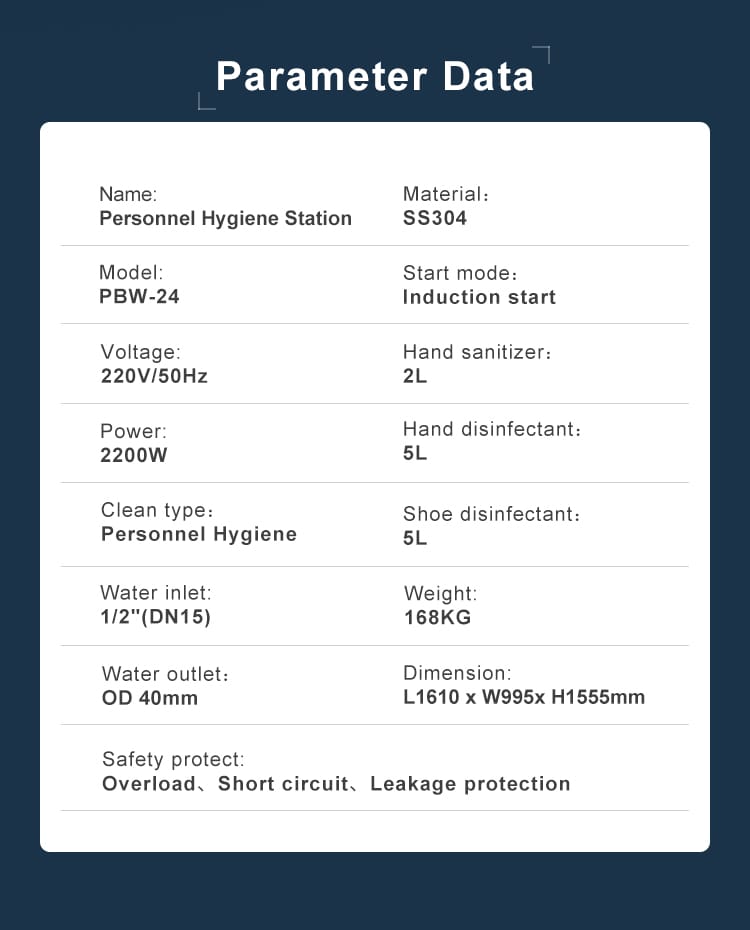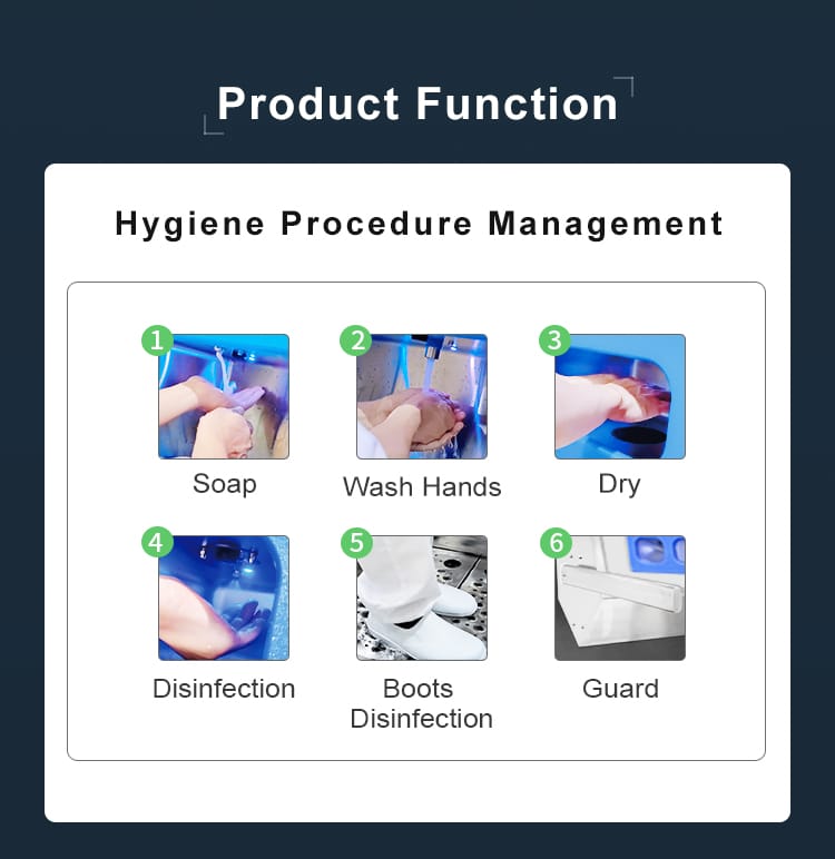 4. Easy Use: our hygiene stations sanitize sensor-based hand and boot cleaning. Furthermore, we also set the voice prompts for hygiene steps, so the food factories do not need to spend additional time on training and use.