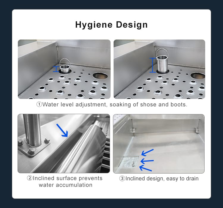 1. Hygiene Compliance: our hygiene stations are with the functions of personnel hand and boot cleaning and sanitizing, designed to comply with hygiene standards and regulations such as BRC, IFS, HACCAP, SQF, FSSC 22000, ISO2200, etc. in the food industry.