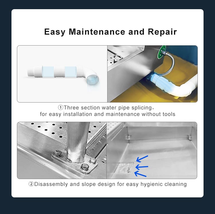 3. Easy Installation: our machines are simple to install and only require water, electricity, ventilation, and the insertion of spliced drain pipes. In addition, the hygiene stations are split structure designs suitable for workshops with different entrance sizes.