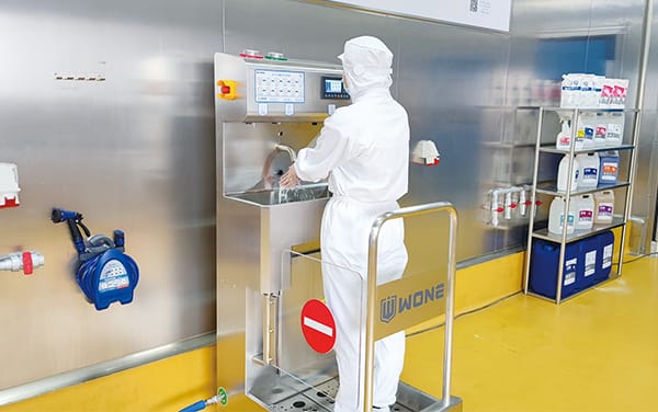 - if the hand washing steps are missing, such as not disinfecting hands, then the gate will not open, employees cannot pass through, and cannot enter the workshop. The risk of contamination is eliminated.